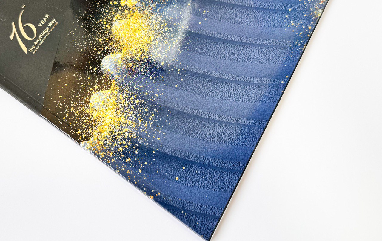 Первое впечатление создаёт обложка — и в этом проекте она стала отдельным элементом дизайна. Для неё выбрана мелованная бумага плотностью 250 г/м², обеспечивающая прочность и стабильность формы. Поверхность покрыта софт-тач ламинацией, создающей эффект бархатистого прикосновения и премиального качества.